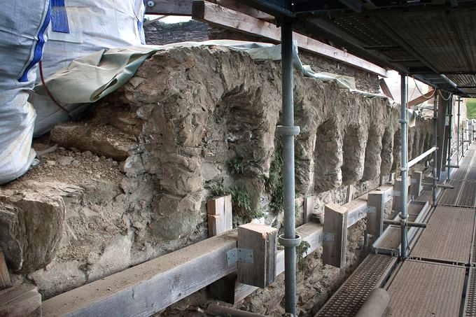 Während dem Ausräumen der Fugen zeigte sich, dass von den ursprünglichen Quaderhäuptern nur noch rudimentäre Reste vorhanden waren. In Bereichen mit historischem Kalkmörtel ließ sich eine deutlich bessere Flankenhaftung erkennen, was auch einen höheren Aufwand zur Folge hatte. Zudem gingen einzelne Mörtel-Bereiche in eine humusartige Fugenfüllung über. Als Folge lösten sich beim Entfernen der geschädigten Fugenfüllung Mauerquader aus dem Verband. Der Quaderverband war folglich nur über die ungebundene Fugenfüllung stabil und die einzelne Steine liegen mehr oder weniger locker im Verband.