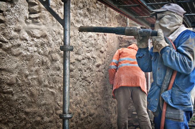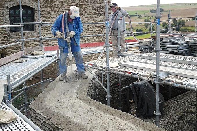 Die Verfugung der Bruchsteinfugen erfolgte maschinell im Trockenspritzverfahren. Aufgrund der hohen Auftragsmenge musste mit dem geringst möglichen Wasseranteil gespritzt werden und unmittelbar mit dem Nacharbeiten der Flächen begonnen werden. Im Zuge der Verfugung wurden die historischen Gerüstdübellöcher von der Bearbeitung ausgespart. Beim Nacharbeiten erfolgte dann eine kreisförmige Anmodelierung der Ränder an die Verfugungsfläche. Historische Bautrennfugen wurden mit einem deutlich sichtbaren Kellenschnit in der Verfugungsfläche markiert.