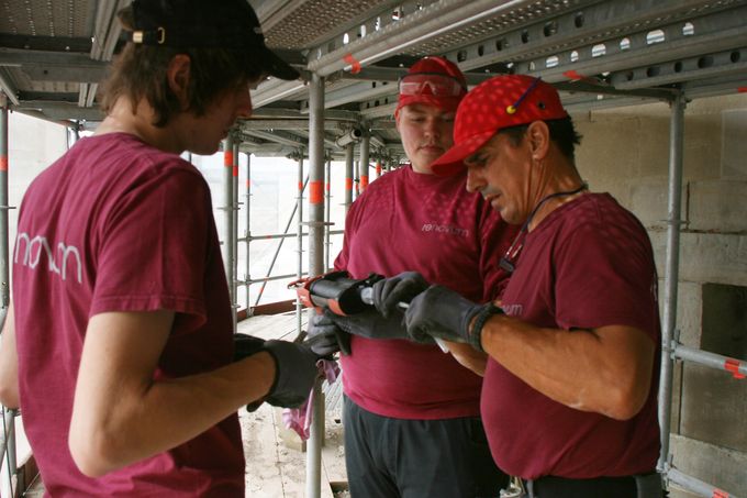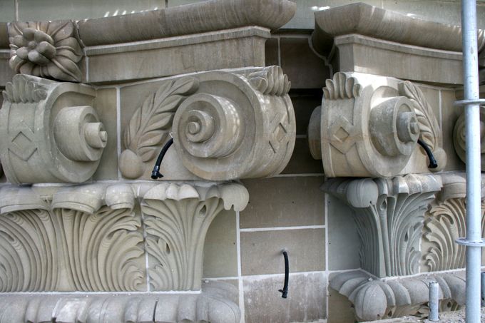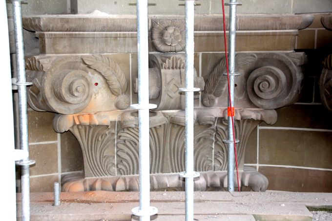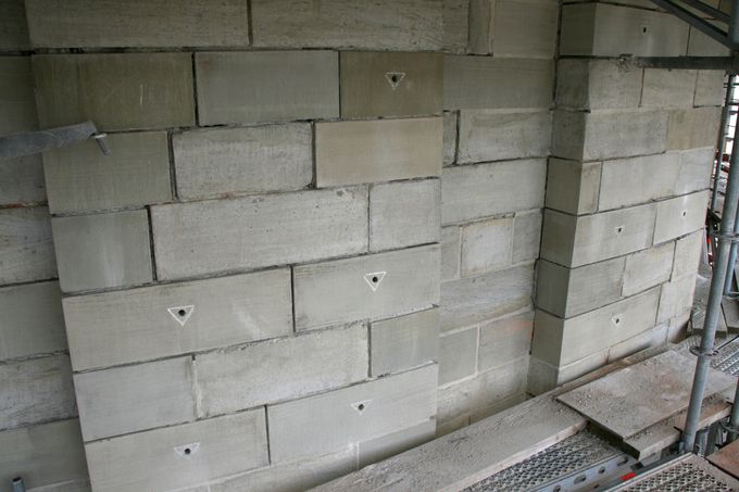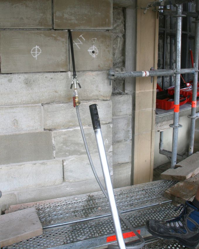 Die ursprünglich angedachte Bohrumfang erschien uns in Anbetracht der Orgel als zu riskant. In Abstimmung mit dem Statiker und nach dem Messen vor Ort wurde die Bohrlöcher in etwas abgewandelter Form festgelegt. Der Durchmesser der Ankernadeln wurde an den Bohrlochdurchmesser bzw. an die Siebhülse angepasst. Entsprechende Musterstücke wurden zur ersten Bauanlaufbesprechung präsentiert. Ebenfalls überarbeitet wurde das Ankerraster, wobei jede Bohrung an der Fassade überprüft , bei Bedarf korrigiert und entsprechend markiert wurde. Die daraus resultierenden Pläne wurden vorab zu Prüfung vorgelegt. Bei dem Mustertermin vor Ort wurde durch Herr Wolf (Fa. Hilti) die Auszugsfestigkeit gemessen. Die Injektage der Hohlräume erfolgte über die Nadelbohrungen. Die Menge der Injektage wurde zum Schutz der Orgel pro Stelle begrenzt. An etlichen Stellen war der Erfolg gut zu beobachten und der Verpressvorgang konnte vor dem Mörtelaustritt gestoppt werden. Nach dem Erhärten des Injektagemörtels wurden die Löcher erneut aufgebohrt, ausgeblasen und gereinigt. Etwaige Unregelmäßigkeiten wurden im Bohrplan notiert. Die Ankernadeln aus V4A- Stahl wurde mittels einer Siebhülse und Hilti HY 100 im Untergrund eingeklebt. Am Nadelende an der Oberfläche erfolgte die Verklebung mit Hilti RE 500 der einen deutlich besseren Klebekontakt herstellt, jedoch auch deutlich schwieriger einzubringen ist. Am Ende der Verklebung wurden unsere Markierungen entfernt, die Fassade und das Gerüst gereinigt. Es folgt die fotografische Dokumentation der Mauerwerkssicherungsarbeiten.